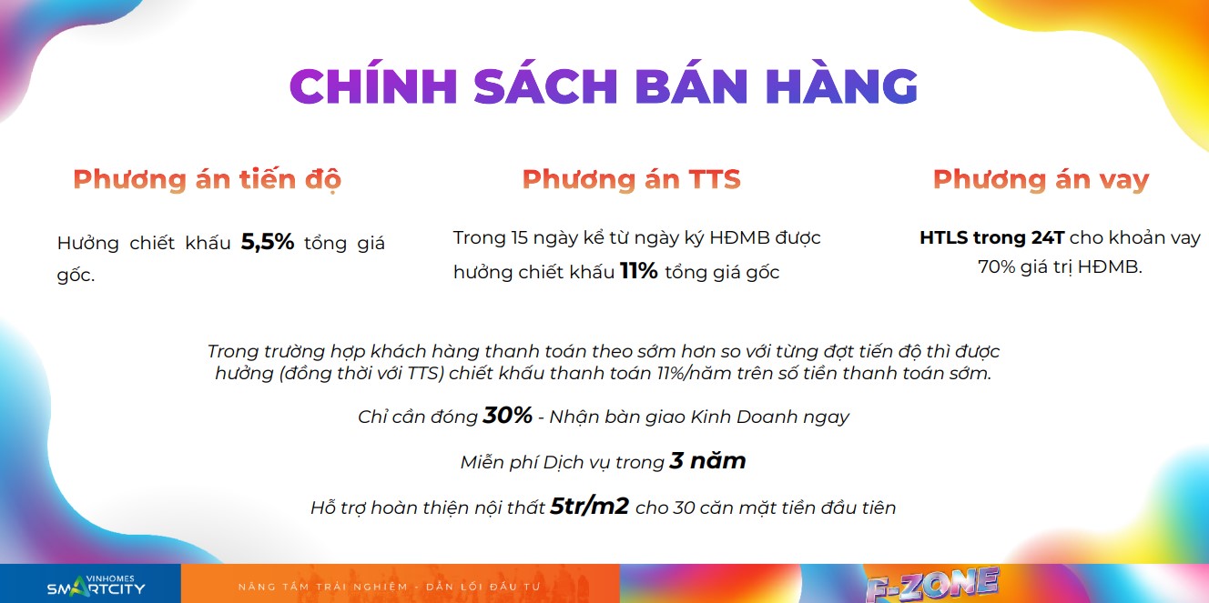 Số lượng khan hiếm khiến giới đầu tư xếp hàng chờ mua hiện tại, Chủ đầu tư đang áp dụng chính sách vô cùng hấp dẫn dành cho những chủ nhân cuối cùng mong muốn sở hữu shop TMDV tại The S-Boutique. Cụ thể, khách hàng sẽ được chiết khấu tới 11% giá bán khi thanh toán sớm, hỗ trợ kinh doanh sớm 5% so với giá bán, hỗ trợ vay 70% với lãi suất 0% trong 18 tháng. Những khách hàng thanh toán sớm trong vòng 15 ngày kể từ ngày ký hợp đồng mua bán còn có cơ hội nhận ưu đãi lên đến 8% và và đặc biệt, tất cả các khách hàng sẽ được miễn phí 3 năm phí dịch vụ kể từ ngày ký HĐMB.